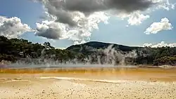 Champagne Pool is a prominent geothermal feature within the Waiotapu geothermal area in the North Island of New Zealand. The terrestrial hot spring is located about 30 km (20 mi) southeast of Rotorua and about 50 km (30 mi) northeast of Taupō. The name Champagne Pool is derived from the abundant efflux of carbon dioxide (CO2), similar to a glass of bubbling champagne. The hot spring was formed 900 years ago by a hydrothermal eruption,[1] which makes it in geological terms a relatively young system. Its crater is about 65 m (213 ft) in diameter with a maximum depth around 62 m (203 ft) and is filled with an estimated volume of 50,000 m3 (1,800,000 cu ft) of geothermal fluid.[2]