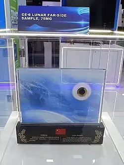 The mission's lander collected 1,935.3 grams (68.27 oz) of lunar far-side material including surface soil and rocks (using a scoop) and subsurface samples (using a drill).[11] With the return capsule's re-entry back to Earth, China became the first nation to bring back samples from the far side of the Moon.[16]