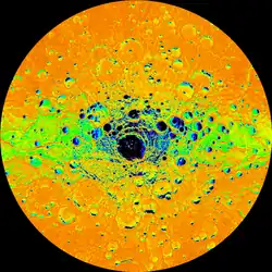 Chao Meng-Fu is a 167 km (104 mi) diameter crater on Mercury named after the Chinese painter and calligrapher Zhao Mengfu (1254–1322). Due to its location near Mercury's south pole (132.4° west, 87.3° south) and the planet's small axial tilt, an estimated 40%[1] of the crater lies in permanent shadow. This combined with bright radar echoes from the location of the crater leads scientists to suspect that it may shelter large quantities of ice protected against sublimation into the near-vacuum by the constant −171 °C (−276 °F) temperatures.