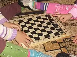 Chapayev (Russian: игра в Чапаева, romanized: igra v Chapayeva, 'game of Chapayev' or 'Chapayev's game') is a board game, a hybrid of checkers (draughts) and gamepiece-impact games like carrom, novuss, and pichenotte, giving it gameplay aspects in common with both billiards and table shuffleboard on a smaller scale, as well as some checkers strategy. It is played throughout the territory of the former USSR. The aim is to knock the opponent's pieces off the board. The game is named after the Russian Civil War hero, Vasily Chapayev.