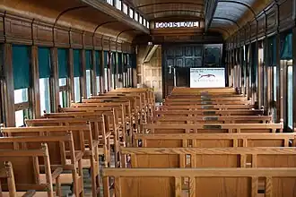The car traveled in the Western and Northwestern states and territories until 1938, where it sat on a spur in South Fork, Colorado. In 1942, a decision was reached to retire the aging chapel car to a Baptist camp at Swan Lake, South Dakota, where it served as a meeting room for thirteen years before being sold for scrap. The old car was then used for storage by an engineering company. While there, a carpenter for the Prairie Village park saw the car and realized its potential to be restored. The Emmanuel was added to the National Register of Historic Places in 1976 and was fully restored by 1982.[2][3] Its permanent home is at Prairie Village.[2][4]