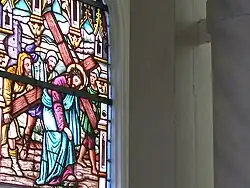 The current building was constructed at the request of Conte to his daughter Genoveva Conte Pieruccini, who fulfilled her father's final wish with the help of the community and the architect Luigi Valiera. It was inaugurated on January 31, 1937, in the presence of Bishop José Barea and replaced the old wooden chapel with a beaten earth floor built by Conte at the end of the 19th century. In 1942, the land was donated to the Diocesan Chancery and passed to the administration of the Parish of Our Lady of Lourdes. The chapel also features important pieces by Michelangelo Zambelli, such as Our Lady of Sorrows (1938) and Our Lord of the Steps (with crystal eyes and real teeth, from 1942). A fresco from 1952 by Aldo Locatelli depicting the resurrection of Christ adorns the ceiling above the main altar. The windows are decorated with a series of 14 stained glass windows depicting scenes from the Way of the Cross, made by Hans Viet & Cia. from Porto Alegre. On July 8, 1983, a fire broke out near the chapel's sacristy, destroying part of the wooden building at the back.[3][1]