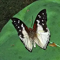 Charaxes hadrianus, the Hadrian's white charaxes, is a butterfly in the family Nymphalidae.This is a very rare charaxes, especially in West Africa. Individuals come to fruit-baited traps.[3] Schultze states that freshly captured males emit a smell of violets.[4]