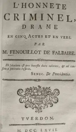 • L'Honnête Criminel, ou l'Amour filial, drama in 5 acts and in verse, published in 1767 and given in Paris, by M. de Villeroy, Comédiens français, 2 February 1768; Paris, Théâtre de la Cour, Comédiens ordinaires du Roi, 10 July 1769. Read online