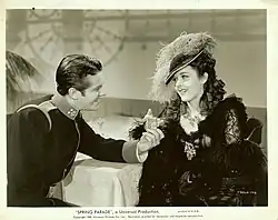 Pasternak used him again, supporting another singing star, Gloria Jean, in The Under-Pup (1939).[55] (He was meant to reteam with Jean in Straight from the Heart, but it appears not to have been made.[56]) In August 1939 Columbia wanted him for the lead in Golden Boy, but could not come to terms with Universal.[57] Cummings supported Basil Rathbone and Victor McLaglen in Rio (1939), then was borrowed by 20th Century Fox to romance Sonia Henie in Everything Happens at Night (1939). At Universal he had a key role in Charlie McCarthy, Detective (1939), then was borrowed by MGM to play the lead in a B movie with Laraine Day, And One Was Beautiful (1940). Back at Universal, Cummings was the romantic male lead in a comedy, Private Affairs (1940); then he romanced Durbin again in Spring Parade (1940). Cummings made his mark in the CBS Radio network's dramatic serial titled Those We Love, which ran from 1938 to 1945. He also played the role of David Adair in the serial drama Those We Love, opposite Richard Cromwell, Francis X. Bushman and Nan Grey.