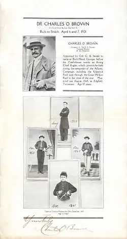 After the outbreak of the American Civil War in 1861, Brown's father, Major Oliver M. Brown, was involved in organizing Company C of the 3rd Ohio Cavalry. Charles Oliver Brown went off to war with his father as a bugler at the age of 13 and saw action in 25 battles. He was wounded in action and earned the nickname, "The Boy Bugler" of Sherman's Army. At age 16 he was made chief of the regiment's 26 buglers, the youngest chief bugler in the Union forces at that time.[7]