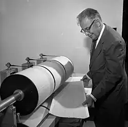 The pair designed a seismograph that measured this displacement and developed a logarithmic scale to measure intensity.[3] The name "magnitude" for this measurement came from Richter's childhood interest in astronomy – astronomers measure the intensity of stars in magnitudes. Gutenberg's contribution was substantial, but his aversion to interviews contributed to his name being left off the scale. After the publication of the proposed scale in 1935, seismologists quickly adopted it for use in measuring the intensity of earthquakes.[3]