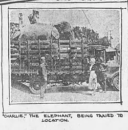 Apparently formerly known as Prince Rajah, Charlie the Elephant weighed just shy of five tons (4,500 kg).[1][2] He may have been found hauling teakwood near Calcutta in 1889 or 1899 by a scout for Karl Hamburg and brought to the Berlin Zoo.[2][3][4] Circus manager and actor Duke R. Lee then brought Charlie to the United States in 1902 or 1903.[1][3] Animal collector Frank Buck claimed to have "brought him back from India,"[5] but Buck was known for telling falsehoods.[6] A movie magazine stated in 1923 said that Charlie had been in the United States for 20 years.[7]