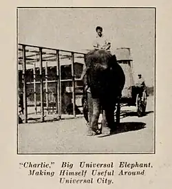 He was supposedly brought to Universal City in 1913 by Curly Stecker with the "first load of lumber that built that city."[2] Another source said he'd been with the studio since 1912.[1] He consumed two 150 lb (68 kg) bales of hay each day.[9] Charlie regularly escaped and wandered around the San Fernando Valley.[2] In 1915, reportedly 30 men armed with rifles and a machine gun went after him.[1] A different claim says that a lone man on horseback found him by the river.[10] One afternoon in 1919, trainer George Englehardt returned him home safely.[11] He was known to bull through the wall of the barn to escape; once he blacked out Universal City by knocking down the electric poles.[1] In 1919 an editorial cartoon suggested that killing trainers was a "pastime" of Charlie's,[12] and in 1920 it was reported that he had "killed several of his attendants during his life."[13] According to a movie magazine, he was eventually condemned to death with the acquiescence of the Humane Society because, "On the average of about once a month, he breaks his chains and fares forth upon Los Angeles, just rarin’ to go...Movie sets, front porches, lamp posts, motor cars, trolley cars, and occasionally a dog, a horse or even a human" had been knocked about or crushed by Charlie.[14]
