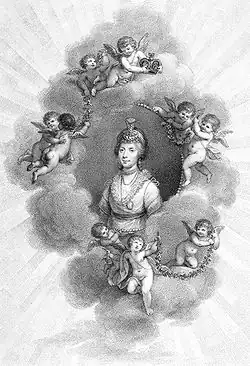 During the Regency of her son, Queen Charlotte continued to fill her role as first lady in royal representation because of the estrangement of the Prince Regent and his spouse.[8] As such, she functioned as the hostess by the side of her son at official receptions, such as the festivities given in London to celebrate the defeat of Emperor Napoleon in 1814.[8] She also supervised the upbringing of her granddaughter, Princess Charlotte of Wales.[8] During her last years, she was met with a growing lack of popularity and was sometimes subjected to demonstrations.[8] After having attended a reception in London on 29 April 1817, she was jeered by a crowd. She told the crowd that it was upsetting to be treated like that after such long service.[8]