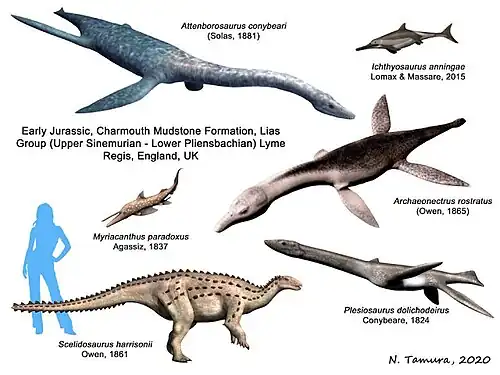 - ^ Bennett, S.P.; Barrett, P.M.; Collinson, M.E.; Moore-Fay, S.; Davis, P.G.; Palmer, C.P. (January 2012). "A new specimen of Ichthyosaurus communis from Dorset, UK, and its bearing on the stratigraphical range of the species". Proceedings of the Geologists' Association. 123 (1): 146–154. Bibcode:2012PrGA..123..146B. doi:10.1016/j.pgeola.2011.07.001.