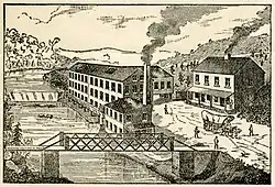 An engraving of the original Elkin Valley Woolen Mill, later Chatham Manufacturing Mill in the 1800s.