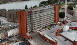 Mountbatten House, built in April 1975,[37] originally known as "Pentagon House",[38] is a prominent 12-storey[39] former banking headquarters,[40] which represents a significant historical structure within the waterfront area. The building is characterized by its slotted precast concrete[41] construction above a crenelated brick plinth,[42] representing mid-20th century brutalism architectural styles in the region.[43][44]