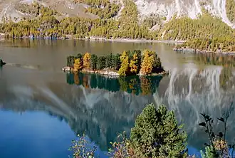 Chaviolas is an island in Lake Sils, located in the canton of Graubünden. It is the largest island in Lake Sils, the second largest being located 100 metres (330 feet) west. The island has a maximum length of 120 metres (390 feet) and a maximum width of 55 metres (180 feet) and includes a 40-metre (130-foot) triangular bay on its northern side. Its highest point is 1,809 metres (5,935 feet) above sea level or 12 metres (39 feet) above lake level (1,797 metres or 5,896 feet), making it among the highest islands in Switzerland and in the Alps. Its surface is entirely wooded. The island lies in the bay south of the peninsula of Chastè, about 200 metres (660 feet) from the shore.