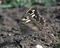 S. briseis L. (= janthe Pall., daedale Bgstr.) (42b). Very variable in size and markings; recognizable by the flat triangular club of the antenna and the pale costal margin of the forewing. The dark wings are traversed by a band which is usually composed of narrow transverse spots, bearing a distinct apical ocellus and a second similar spot before and somewhat below the middle of the distal margin. Band of the hindwing sometimes shaded. On the underside the male has large dark angular spots at the base of both wings, the female having the hindwing beneath generally uniformly brownish or grey; North France, Germany, Austria, Hungary, and the adjacent districts of Russia. — meridionalis Stgr. (42b) is the South-European form, which is especially common on the Mediterranean coasts of Europe. The white spots composing the band of the forewing are broader than in specimens from Central Europe. — magna Stgr. is the from East Europe, which flies also in some districts of Asia Minor; in size like meridionalis, but the band somewhat broader and purer white, especially on the hindwing. — ab. pirata Esp. (42 f) has the size of the previous, but the band is ochreous; occurs among white-banded specimens in South and East Europe, and Anterior Asia, being especially large in the last country. — major Oberth. (42 c) is still considerably larger than meridionalis, the band of the forewing being much narrower, and differs at a glance from all the other forms of briseis in the hindwing beneath, on which in the male the dark triangular spot at the middle of the hindmargin is wanting and the dark longitudinal spot above the middle of the cell is quite light green-grey and not sharply defined. This large form is locally not rare in North Africa, in the Aures Mts. and the Kabylie. — hyrcana Stgr. (42 b) is similar to magna, the white band on the upperside being very narrow and the underside very conspicuously variegated; in Persia and various places of Anterior Asia, especially in the Achal-Tekke country. —fergana Stgr. (42c) is the largest form, which has a rather large white band and in the female a reddish grey underside; from Asia Minor and the Pamir. — turanica Stgr. is nearly as large, the band not being very broad and on the hindwing of the male distinctly tinged with red-brown. — maracandica Stgr. (42 b), from Samarkand, is a medium-sized form which has very much white, the median band of both wings being very broad and in addition the distal margin of the hindwing being broadly white. — Larva yellowish grey, with a dark dorsal stripe and dark subdorsal lines; two light lateral lines above the spiracles, the stigmata themselves being black; venter light grey; till June on grasses. Pupa brownish yellow, with a darker dorsal stripe. The butterflies from July till September; they prefer chalky soil and love to settle on bare places of the ground and on boulders. The flight is low and hopping in the small northern form, stately, floating and rather fast in the large forms from Africa and Asia Minor. The butterfly now and again visits scabious thistles or other composites, keeping the wings tightly closed when resting.[1]