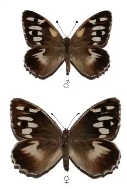 Satyrus prieuri Pier. (42 d, e). This butterfly resembles the preceding species above [ heydenreichi ], but the transverse patch of white streaks which extends across the forewing above the apical ocellus does not reach the costa; the oval blotch in the cell of the forewing is so strongly shaded with brown that it contrasts but slightly with the ground-colour, and the white discal band is somewhat more distinct than in heydenreichi, though it has no smear-like projection towards the base. The underside of the hindwing, particularly in the female, is more extensively, though less distinctly, spotted with greyish brown, so that it approaches to a certain extent that of semele, the angulated spots not appearing so conspicuous as in briseis and heydenreichi.[1]