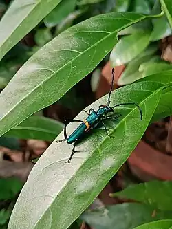 The adult beetles are a bit more than an inch long and are dark metallic blue with a transverse yellow to orange band midway on the elytra. The band is transverse in the inner half of the elytra and extends posteriorly on the outer edge.[1] The adults emerge in May and June after the rains and eggs are laid in the leaf axils of citrus trees. The larvae hatch and bore into the shoots, boring upwards and then girdling the tip of the branch which withers and turns black. It then bores inwards and pupates, emerging in a year. The populations can cause damage in citrus cultivation where they are managed by physical removal of the adults and by cutting of the branches showing girdling damage.[2]