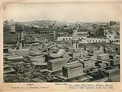 The August issues of Baku newspaper Kaspi in 1882 noted that the location of the cemetery in the immediate vicinity of the residential buildings was harmful for the population.[1][8] The newspaper also noted that the cemeteries, particularly the Russian one, begins from the roofs of the outer city houses and to enter the cemetery from the embankment, it is enough to climb the front step of the first house, to jump directly from the last step to the graves, and a small step from the roof of those houses is enough to end up in the cemetery.[1]