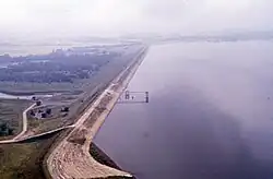 The reservoir is impounded at its southeastern end by Cheney Dam (National ID # KS00017). The dam is located at 37°43′31″N 97°47′51″W / 37.72528°N 97.79750°W (37.7252898, -97.7975511) at an elevation of 1,417 feet (432 m).[10] The middle portion of Cheney Dam lies in the northwest corner of Sedgwick County, its southwestern end lies in Kingman County, and its northeastern end lies in Reno County.[7][8][9] The North Fork Ninnescah River is both the reservoir's primary inflow from the northwest and its outflow to the southeast.[6]