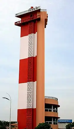 The present lighthouse is a triangular cylindrical, red-and-white-banded, concrete one with lantern and double gallery and is 11 stories high. The tower is attached to a three-story circular harbour-control building. The total height of the tower is 45.72 metres (150.0 ft) with the light source standing at a height of 57 metres (187 ft) from the mean sea level. The source consists of 440V 50 Hz main supply (with standby Genset), with a range of 28 nautical miles. It is functional since 10 January 1977.[4]