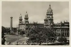 In 1834, further to the petition by vice-admiral Sir John Gore about the necessity to have a more advanced lighthouse, the East India Company asked Capt. T. J. Smith of the Corps of Engineers, then on home leave in England, to suggest alternatives. When Capt. Smith returned to Madras in 1837, he brought with him a new apparatus. By then, ships, which were anchored in front of the Fort thus far, started anchoring off First Line Beach. The old lighthouse was therefore considered a location too far to the south. Incidentally, in the early 19th century, the area west of Fort St. George was the buffer zone between the Black Town and the fort which has come to be known as George Town. A fire in 1762 destroyed this area including two temples, the Chenna Kesavapperumal temple and the Chenna Malleeswarar temple that flourished in the area. The colonial government took possession of this land and facilitated the construction of these temples near the Flower Bazaar. It then considered the construction of a new lighthouse on this land.[5] This led to the choosing of a site on the Esplanade "between the Fort and the offices of Parry & Co" as the location for the new lighthouse.[6] Thus, the second lighthouse was erected during 1838–1844 on the north side of Fort St. George. Work began in 1838 on a granite column in the compound of the present High Court.[5] The column was designed by Smith, who had by then been promoted to Major. The stone for the construction was sourced from quarries in Pallavaram.[6] Work was completed in 1840[5] at a total cost of ₹ 60,000,[6] on which the wick lamp was shifted as the supply of the new equipment by Stone Chance, Birmingham was delayed.[5] The apparatus cost a further ₹ 15,000 and was of the most sophisticated kind for its times. On 9 October 1843, a public announcement was made that the new Madras Light was completed and it would be fully functional from 1 January 1844. Major Smith was asked to remain in charge until a team was trained to take over the handling of the equipment. He handed over charge to the master attendant of the Madras Harbour on 6 October 1845. The lighthouse had a full complement of staff comprising a superintendent, a deputy, a headman and six lascars. The monthly operational cost, inclusive of 208 measures of oil was ₹ 227 and 3 annas. It was to be the Madras Light for the next 50 years until 1894, when the British government felt the height of this lighthouse was not sufficient and decided to build a new, taller lighthouse,[5] leading to the High Court's tallest dome becoming the third lighthouse of Madras.[6] Today, this second lighthouse is under the watch of the Department of Archaeology as a protected monument.[5][7]