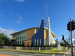 A United Methodist Free church opened on Sunday 11 August 1878 on the corner of Gympie Road and Banfield Street, (then Church Street, approx 27°22′54″S 153°01′23″E / 27.3818°S 153.0230°E).[8][9] In 1926, a more central site was purchased on the south-east corner of Gympie Road and Hamilton Road and the church building was relocated to the new site and renovated.[10][11][12] It was replaced by a brick church which opened on 30 September 1950.[13] It became part of the Uniting Church in 1977. This brick church was demolished in 2004,[14] probably because the current Chermside-Kedron Community Church (a Uniting Church) in Chermside on the north-western corner of Gympie Road and Rode Road had opened on 23 September 2001.[15][16]