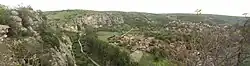 The lower part of the river falls within the Rusenski Lom Nature Park, protecting the rich wildlife, rock formations and cave sanctuaries dated from the Second Bulgarian Empire of the 12th to 14th centuries.[3] There are numerous caves along the Cherni Lom valley, including Orlova Chuka on the left bank, which is the third longest cave in Bulgaria with a length of over 13.4 km.[4][5] The ruins of the important medieval Bulgarian fortress of Cherven rise over a steep meander of the river near the homonymous village.[6]