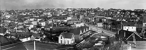 The northern section of current-day Cherry Hill near Madison Street was originally named Second Hill, then later Renton Hill.[4] The portion of the current-day Cherry Hill neighborhood bounded by Union and Cherry Streets and 10th and 20th Streets was added to the city of Seattle in 1870 as the Edes and Knight addition, and was replatted in 1890.[5][6] A more southern section between Cherry and Alder Streets and 12th and 20th Avenues was added in 1890 as the Squire Park addition, after former Washington Territory governor and US Senator Watson Squire, who formerly owned the land in that section.[7] The name Cherry Hill was suggested by city councilmember Harlan Edwards in 1959 to describe the area for an Urban Renewal Project bounded by Cherry and Yesler Streets and 17th and 23rd Avenues, which includes Squire Park.[8] The name Cherry Hill was subsequently widely used throughout this area in the 1960s and 1970s, and was also used for structures north of Cherry Street such as the Cherry Hill Community Center and the Cherry Hill Baptist Church.[9][10] The naming of a larger neighborhood named Squire Park bounded by Union and Jackson Streets and 12th and 23rd Avenues appeared with the establishment of the Squire Park Neighborhood Council in 1986.[11] The renaming of Providence Hospital to Swedish Medical Center Cherry Hill in 2007 reintroduced the name Cherry Hill to the area from Madison Street to the hospital.[12]
