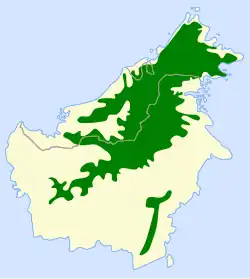 The chestnut-hooded laughingthrush is endemic to Borneo, where it is found in the north-central mountain ranges from Mount Kinabalu to Barito Ulu, along with the Meratus Mountains in the southeast of the island. It inhabits evergreen montane forest and hill forest, forest edge, secondary forest, disturbed vegetation, and cultivated areas such as short growth in old rice fields. It is usually found at elevations of 600–2,800 m (2,000–9,200 ft), but may sometimes be seen as low as 200 m (660 ft) and as high as 3,350 m (10,990 ft).[15][16]