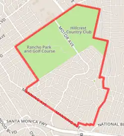 In the Mapping L.A. project of the Los Angeles Times, Cheviot Hills' street and other borders are Rancho Park Golf Course and Hillcrest Country Club to the northwest; Anchor Avenue and Club Drive to the east; and Manning Avenue to the southwest.[33][34] Using these boundaries, Cheviot Hills is flanked on the north by West Los Angeles and Century City, on the east by Beverlywood and Castle Heights, on the south by Palms, and on the west by Rancho Park.[35]