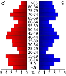 In the county, the population was spread out, with 23.80% under the age of 18, 5.10% from 18 to 24, 22.70% from 25 to 44, 21.80% from 45 to 64, and 26.60% who were 65 years of age or older. The median age was 44 years. For every 100 females there were 97.30 males. For every 100 females age 18 and over, there were 92.40 males.