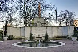 The memorial is made of Portland stone and has seats backing on to a decorative screen facing a small pond.[1] An inscription at the centre of the screen reads:[2]