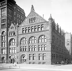 In 1893, the club decided it needed larger quarters, and it purchased from the Art Institute of Chicago its former building on the corner of Michigan Avenue and Van Buren Street. This building has been put up in 1886-1887 and was designed by Burnham and Root to be the first home of the Institute, which moved across the street to its current location in 1892. This building remained the clubhouse until the 1920s, when it collapsed during remodelling.[6]