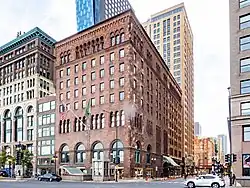 To replace it, Granger and Bollenbacher designed an eight-story granite building in the Romanesque Revival style, which was completed in 1929. During construction, Burnham & Root's triple-arched entrance was moved around the corner from Michigan Avenue to Van Buren Street, where it remains the main entrance to the building, which was listed on the National Register of Historic Places in 2005, and continues as the club's headquarters today.[6]