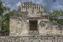 Structure I is a temple located in the main plaza characterized by four relief panels constructed in the Rio Bec style.[4] The Rio Bec style is defined as a temple pyramid built in the central Maya lowlands.[2] Unlike other architectural styles in the Maya Lowlands, Rio Bec architecture style is characterized by structures positioned at greater distance from one another, resulting in a less dense site layout.[2] Other sites with the Rio Bec architectural style include Becan and Xpuhil, both located within 3 km from Chicanná.[4][5] Due to their location and similar architectural style, Becan and Xpuhil are believed to have interacted with and were connected to Chicanná.[5][4] Structure I consists of six total rooms and with five risers facing inward towards the plaza.[4]