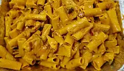 Chicken riggies or Utica riggies is an Italian-American pasta dish native to the Utica–Rome area of New York State.[1][2] Although many variations exist, it is a pasta-based dish typically consisting of chicken, rigatoni, and hot or sweet peppers in a spicy cream and tomato sauce.[3][4][5] Many of the chefs from the Utica area seem to have a claim to the dish, yet there seems to be no clear idea who was the originator.[6]