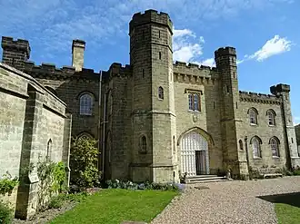 The first significant building to occupy the site of the castle was a timber-framed dwelling, inhabited from the early 16th century by Richard Streatfeild, an iron master and wool merchant. Little remains of this first structure as, in 1679, Henry Streatfeild (1639–1719) had the house rebuilt in red brick in the Restoration style.[1] The building was known as High Street House or High Street Mansion since it fronted the village high street. Remodelling of the house's grounds in the 19th century resulted in the current diversion of the road through the village.[2]