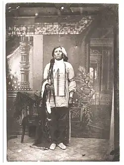 Rattling Blanket Woman or Tȟašína Ȟlaȟlá Wiŋ (1814–1844) was the daughter of Black Buffalo and White Cow (also known as Iron Cane).[11] Her older siblings were Lone Horn (born 1790, died 1877) and Good Looking Woman (born 1810). Her younger sister was named Looks At It (born 1815), later given the name They Are Afraid of Her. The historian George Hyde wrote that Rattling Blanket Woman was Miniconjou and the sister of Spotted Tail, who became a Brulé head chief.[12] She may have been a member of either of the family of Lone Horn, one of the leaders of the Miniconjou. She was said to be beautiful and a fast runner.[13][14][11]