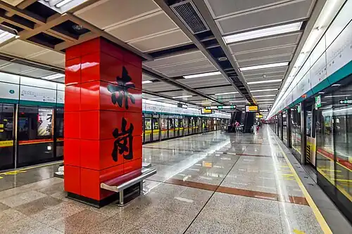 Chigang Station (simplified Chinese: 赤岗站; traditional Chinese: 赤崗站; pinyin: Chìgǎng Zhàn; Cantonese Yale: Cěkgōng Jaahm) is a station on Line 8 of the Guangzhou Metro. It started operations on 28 June 2003. It is located to the northeast of the junction of Xingang Middle Road (新港中路) and Jiangnan Avenue (江海大道) in the Haizhu District.[1]