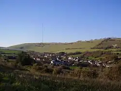 The nearby Chillerton Down is the site of an unfinished Iron Age promontory fort and a 229-metre (751 ft) antenna for the Isle of Wight radio station broadcasting on 107.00 MHz, as well as several other stations.[3] It is the village's most prominent feature and can be seen from most parts of the island. It is known as the Chillerton Down transmitting station.[3] Chillerton Down is flown by Paragliders in a E to SE wind and on days with good thermals the top of the mast can be reached.