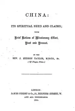 - ^ James Hudson Taylor (1865). China; its spiritual need and claims; with brief notices of missionary effort, past and present. James Nisbet.