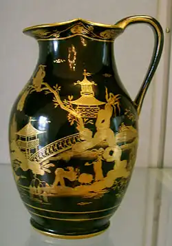 One of the things that contributed to the popularity of chinoiserie was the 18th-century vogue for tea drinking.[29] The feminine and domestic culture of drinking tea required an appropriate chinoiserie mise en scène. According to Beevers, "Tea drinking was a fundamental part of polite society; much of the interest in both Chinese export wares and chinoiserie rose from the desire to create appropriate settings for the ritual of tea drinking."[2] After 1750, England was importing 10 million pounds of tea annually, demonstrating how widespread this practice was.[30] The taste for chinoiserie porcelain, both export wares and European imitations, and tea drinking was more associated with women than men. A number of aristocratic and socially important women were famous collectors of chinoiserie porcelain, among them Queen Mary II, Queen Anne, Henrietta Howard, and the Duchess of Queensbury, all socially important women. This is significant because their homes served as examples of good taste and sociability.[31] A single historical incident in which there was a "keen competition between Margaret, 2nd Duchess of Portland, and Elizabeth, Countess of Ilchester, for a Japanese blue and white plate,"[32] shows how wealthy female consumers asserted their purchasing power and their need to play a role in creating the prevailing vogue.