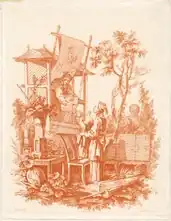Even though the root of the word 'chinoiserie' is 'Chine' (China), the Europeans of the 17th and 18th centuries did not have a clear conceptualization of how China was in reality. Often terms like 'Orient', 'Far East' or 'China' were all equally used to signify the region of Eastern Asia that had proper Chinese culture as a major representative, but the meaning of the term could change according to different contexts. Sir William Chambers for example, in his oeuvre A Dissertation on Oriental Gardening of 1772, generically addresses China as the 'Orient'.[8] In the financial records of Louis XIV during the 17th and 18th centuries were already registered expressions like 'façon de la Chine', Chinese manner, or 'à la chinoise', made in the Chinese way. In the 19th century the term 'chinoiserie' appeared for the first time in French literature. In the novel L'Interdiction published in 1836, Honoré de Balzac used chinoiserie to refer to the craftworks made in the Chinese style. From this moment on the term gained momentum and started being used more frequently to mean objects produced in the Chinese style but sometimes also to indicate graceful objects of small dimension or of scarce account. In 1878 'chinoiserie' entered formally in the Dictionnaire de l'Académie.[8]