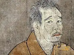 Chinsō, or dingxiang in Chinese, is a Chinese Buddhist neologism, and was originally a translation for the Sanskrit term uṣṇīṣa.[4] The usnisa is the term coined for the fleshy protuberance on top of the Buddha's head.[4] In India it was said to be invisible because it is unable to be seen by living beings.[4] During the Song dynasty in China, the term chinsō began being used for portraits of Zen monks as we know the term today.[4] The existence of a protuberance on top of a Buddha's head represented the fact he had reached enlightenment,[7] similar to how chinsō were thought to prove enlightenment when passed down from a monk to his disciple.