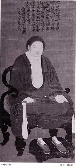When Zen Buddhism was brought to Japan from China, the Chinese style of portraiture as well as these traditions surrounding chinsō, were brought with them. This realistic style was not typical in Japan and set chinsō apart from other portraits at the time in Japan because of their high degree of verisimilitude.[5] Although most easily identifiable chinsō have the subject seated in a chair, in three-quarter profile against a black background, with an inscription at the top, not all chinsō followed this rigid formula.[4] The portraits of Japanese monks Mokuan Shuyu and Ikkyu Sojun represent this identifiable formula, but the alternative version of Ikkyu Sojun does not. Instead of being seated in three-quarter view, the monk or patriarch could be shown frontally, or as a full figure, and could be in a circular frame instead of simply as a figure against a blank background. Less common are chinsō showing a monk in meditation in a landscape setting, where he could be either walking or sitting. Chinsō are usually inscribed at the top with a eulogy written in free verse, describing who the patriarch was, why it was made and possibly who wrote the eulogy and why. Some scholars distinguish chinsō from the soshizō 祖師像 category, which includes portraits of legendary patriarchs from the distant past, by checking whether or not the portrait is inscribed. It's also important to note that the soshizō were not as realistic as the chinsō.[6]