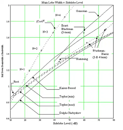 In general, the more the sidelobe levels are lowered, the broader the main lobe will become. However, the various windowing functions do perform differently from one other, with some giving main lobes which are unnecessarily broad for the sidelobe levels achieved. The most efficient function is the Dolph–Chebyshev window (see window functions) as this gives the narrowest pulse at a given sidelobe level.[18] A selection of the better performing windowing functions are shown in the graph of Beamwidth × Bandwidth as sidelobe level.
