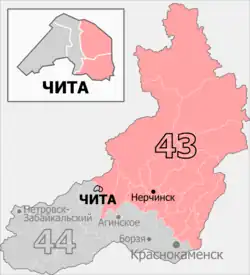 The Chita constituency (No.43[a]) is a Russian legislative constituency in Zabaykalsky Krai. The constituency covers eastern half of Chita and northern Zabaykalsky Krai.