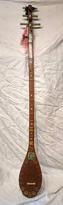 The instrument is not very loud, and is played by strumming the top course of strings with the forefinger while allowing the finger to also play the drone strings. It is related very much to instruments from Central Asia and similar long necked lutes (although not with the strange middle string arrangement which seems to be a regional invention) can be found over the border in the neighbouring countries to the West and North.