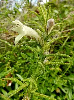Chloanthes stoechadis is a small, branched under shrub that usually grows to 30–90 cm (12–35 in) high with white woolly stems. The leaves are arranged opposite, more or less linear, mostly 0.5–5 cm (0.20–1.97 in) long, roughly wrinkled above, white woolly underneath, dull green, and margins rolled under. The corolla are yellowish green or greenish blue, borne singly in upper leaf axils, tubular to 4 cm (1.6 in) long, mostly hairy inside, pedicel 1–4 mm (0.039–0.157 in) long or almost non-existent. The lower lobe longer, 6–13 mm (0.24–0.51 in) long and 3.5–8 mm (0.14–0.31 in) wide at the base, the style 18–45 mm (0.71–1.77 in) long and stamens both protruding beyond the floral tube. The calyx lobes narrowly oval-shaped, blistered with margins curved or rolled under. The bracts leaf-like, sessile, linear to lance-shaped, 8–17 mm (0.31–0.67 in) long and 1.5–3 m (4 ft 11 in – 9 ft 10 in) wide, wrinkled and blistered on upper surface, woolly underneath, somewhat rough with short, hard protuberances. Flowering occurs usually from July to October, followed by dry, hemispherical fruit.[2][3][4]