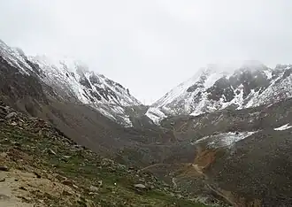 Cho La, also transliterated as Tro La, is a mountain pass across the Chola Mountains in Dege County, Garze Prefecture, Sichuan, China. In Mandarin Chinese, it is known as Qu'er Pass (Chinese: 雀儿山口; pinyin: Què'ér Shānkǒu). The pass reaches a height of 4,916 metres (16,129 ft) and may be snow covered year-round. The pass is an important link between the town of Derge and the rest of Sichuan Province. Historically, it was part of a trade route between Tibet and China through the Kingdom of Derge in Kham.[1] The western flank of the pass is drained by the Zhil Chu (Chinese: 色曲; pinyin: Sè Qū) and the eastern flank is drained by the Tro Chu (Chinese: 朝曲; pinyin: Zhāo Qū). Yihun Lhatso, a glacial-fed lake, is located to the east of the pass.[2]